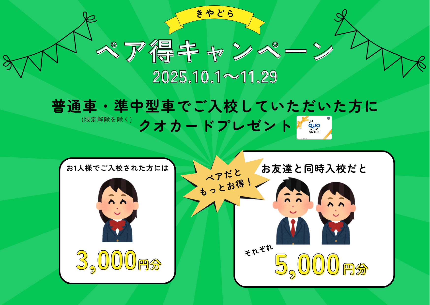 🚗お友達と同時入校の場合→ それぞれ5,000円分のクオカード✨